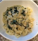 Pasta and white meat chicken with spinach in a parmesan cheese .